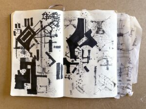 ‘Separately, my sketch book has been increasingly filled with chaos: themes around solid and void, light and dark, compression and release. It’s part prompted by an upcoming project where we are to work with chalk and play with directed weathering, whilst also exploring the creation of form as if both ruinous and rising from the cliff – that starkness of the white is hypnotic.