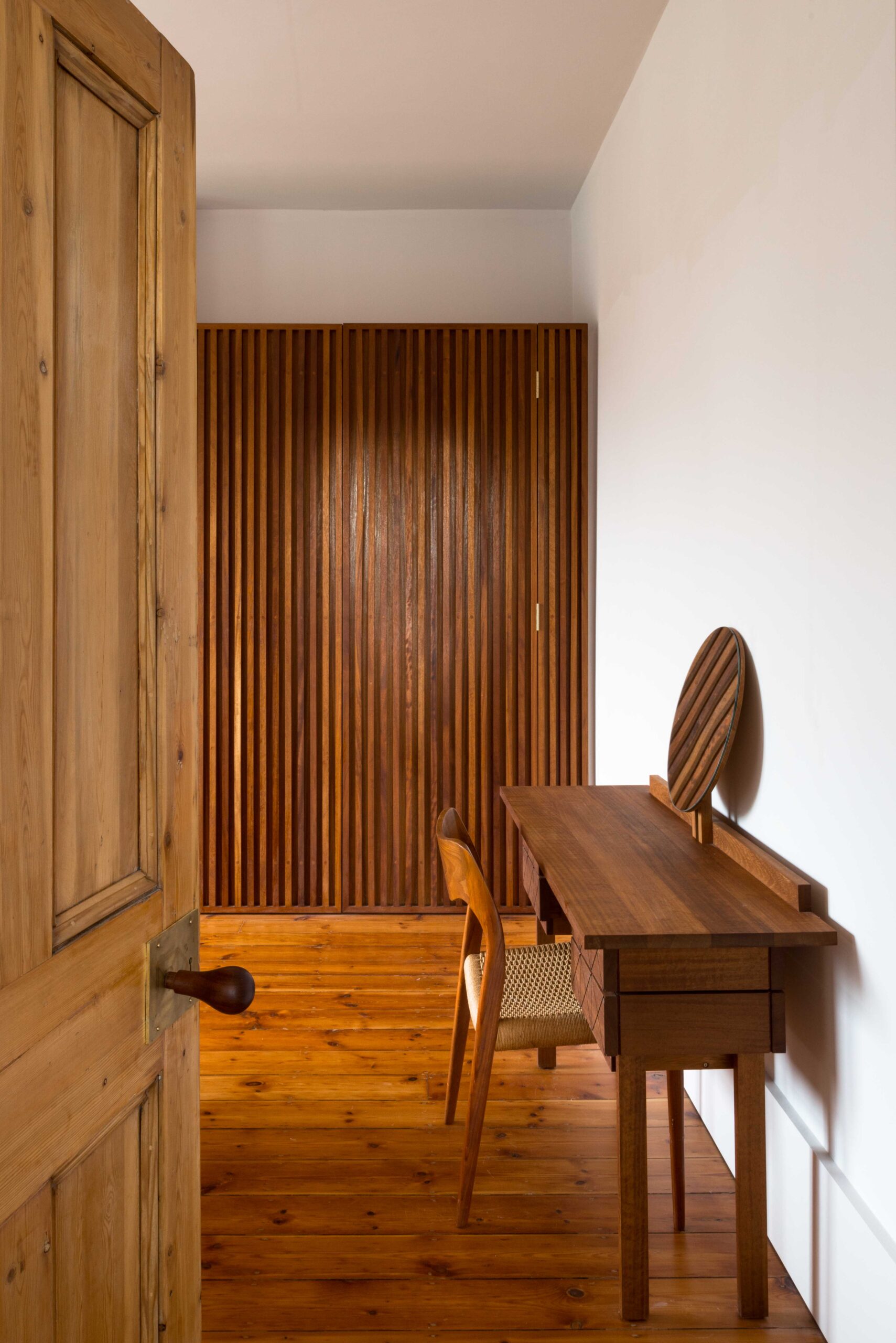 ‘Inventions and interventions were related rigorously to the original fabric – notably a pyramid stretcher brick prominent in the street-facing facade. The pyramid’s form is used in two ways. In its graphical manifestation, it is flattened and appears as a cross on furniture and other elements. In relief, as a further abstraction of the cross motif, it appears as a single, slanted line rendered in notched, vertical slats.’